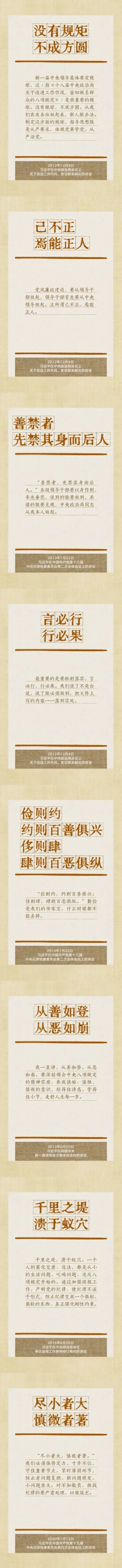 党的十八大以来,习近平总书记多次就抓好党的作风建设、贯彻落实中央八项规定精神发表重要讲话,作出重要批示,提出明确要求。“没有规矩,不成方圆”、“己不正,焉能正人”、“尽小者大,慎微者著”······总书记引用的这些古语耐人寻味。