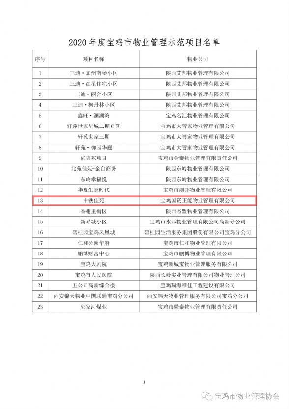7月初,宝鸡市物业管理协会公布了2020年度物业管理示范项目的评选结果,宝鸡国资正能物业管理有限公司中铁佳苑项目荣获“2020年度宝鸡市物业管理示范项目”荣誉称号。 此次评选标准涵盖八大板块59项标准,涉及物业日常基础、房屋管理与维修养护、共用设施设备管理、秩序维护管理、环境卫生管理、绿化管理、精神文明建设及经营效益等多方面内容。正能物业中铁佳苑项目以完善的管理服务台账、安全和谐的公共秩序、整洁优美的小区环境、运行良好的设施设备、科学智能的物业管理信息运用,得到了考评组的高度认可。 此项荣誉的获得充分彰显了正能物业的服务水平与实力,对进一步提升物业服务管理水平起到了极大地推动作用。未来,正能物业将继续建立健全一系列管理制度,做到服务措施精细化、服务标准科学化、服务流程规范化,实现服务品质的持续提升,为新时代国资国企改革发展奉献新担当、彰显新作为、凝聚新动力。