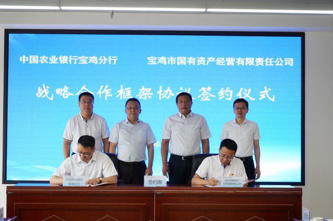 7月22日上午,宝鸡市国有资产经营有限责任公司与中国农业银行宝鸡分行成功举行战略合作框架协议签约仪式。宝鸡市国资委党委副书记张桂存,宝鸡市国资委党委委员、副主任毛东波出席签约仪式,农业银行宝鸡分行党委书记、行长方胥良,市国资公司党委书记、董事长罗鹏伟分别致辞,签约仪式由市国资公司党委委员、常务副总经理崔建新主持。