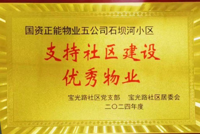 物业无小事,枝叶总关情 正能实业公司始终秉承 “以人为本,服务至上”的工作宗旨, 持续打造国有物业企业靓丽名片。 党建赋能共建幸福家园 ——五公司石坝河项目荣获“支持社区建设优秀物业”称号