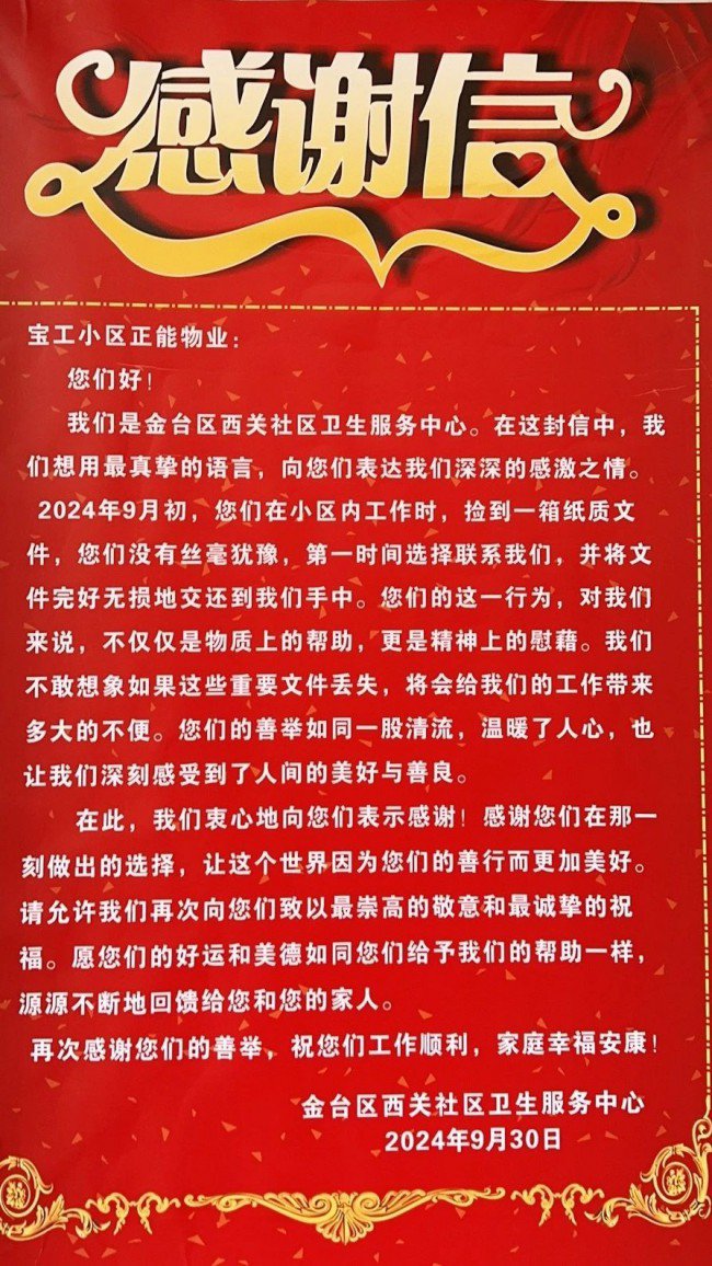 近日,宝鸡国资正能实业发展有限公司宝工小区物业办,收到了来自金台区西关社区卫生服务中心送来的“优秀团队 品德高尚”字样的大红锦旗,以及一封饱含深情的感谢信。这一切源于一次看似平凡的日常保洁工作,保洁员在打扫卫生时意外捡到了社区医院遗失的重要文件,并及时归还,这一行为不仅体现了员工的专业素养和服务态度,更展示了正能实业团队的太阳集团城官网和底蕴,员工用实实在在的行动和举措赢得了信任与赞誉。 未来,正能实业公司将一如既往地做好各项物业服务工作,继续为民解难事,以情暖人心,用最真诚、最专业、最高效的服务对待每一位业主,践行国企的责任和担当,以匠心铸品质,以品质树标杆,为业主打造一个安心,舒心,放心的美好家园。 |